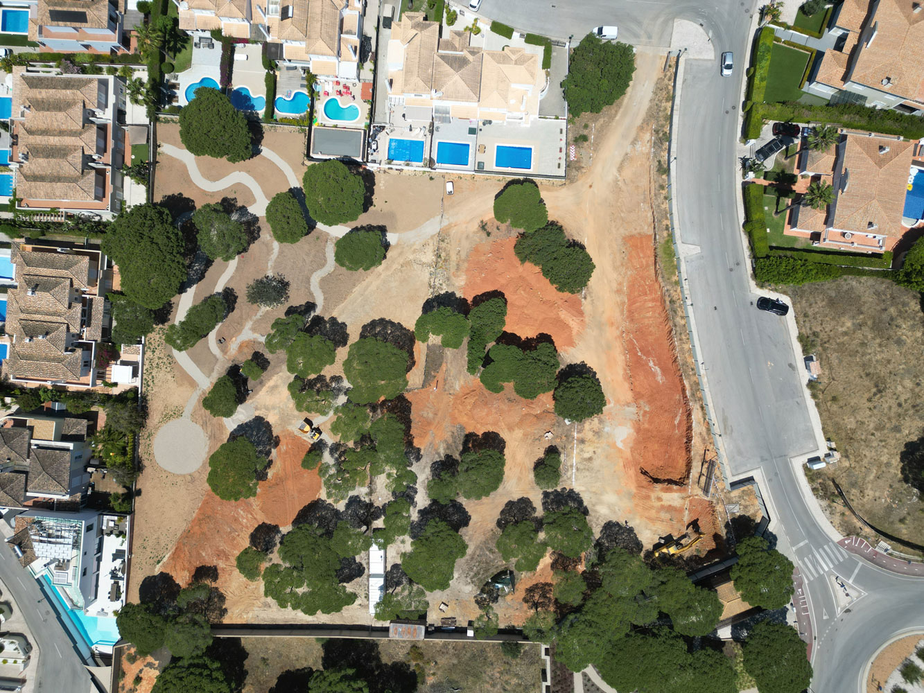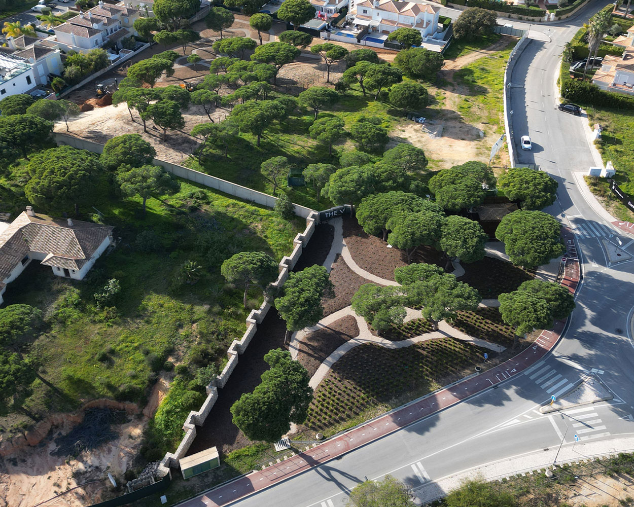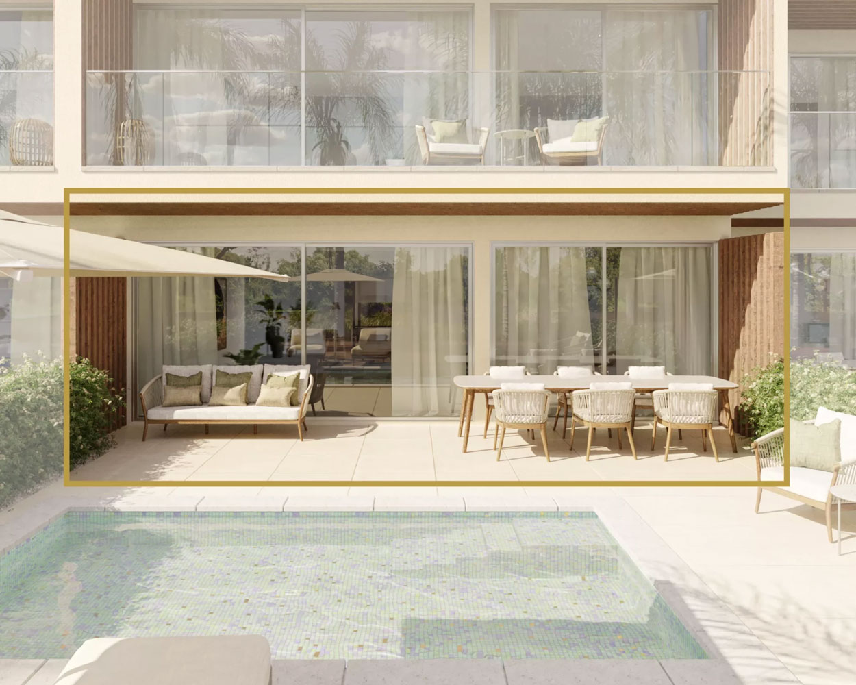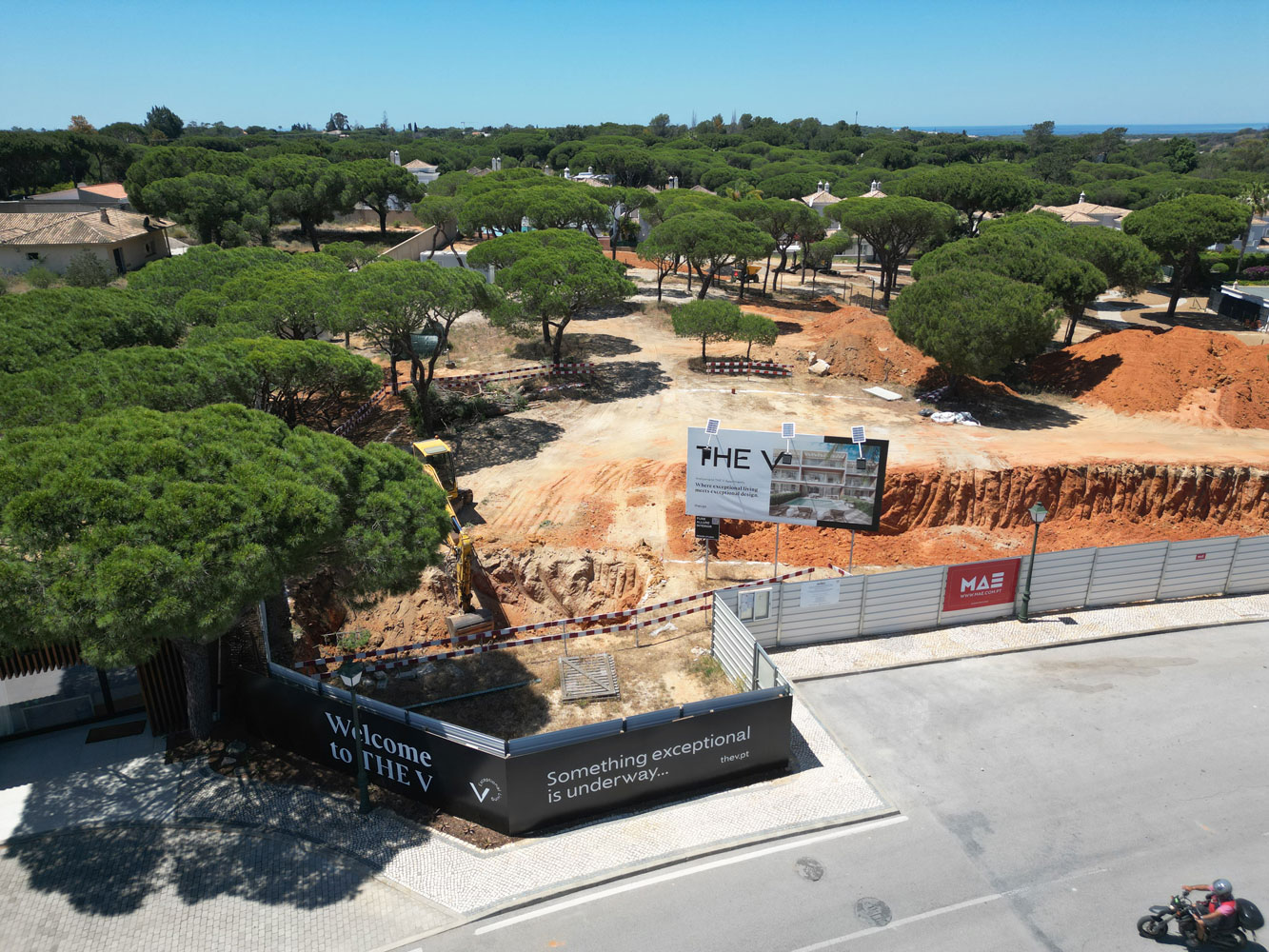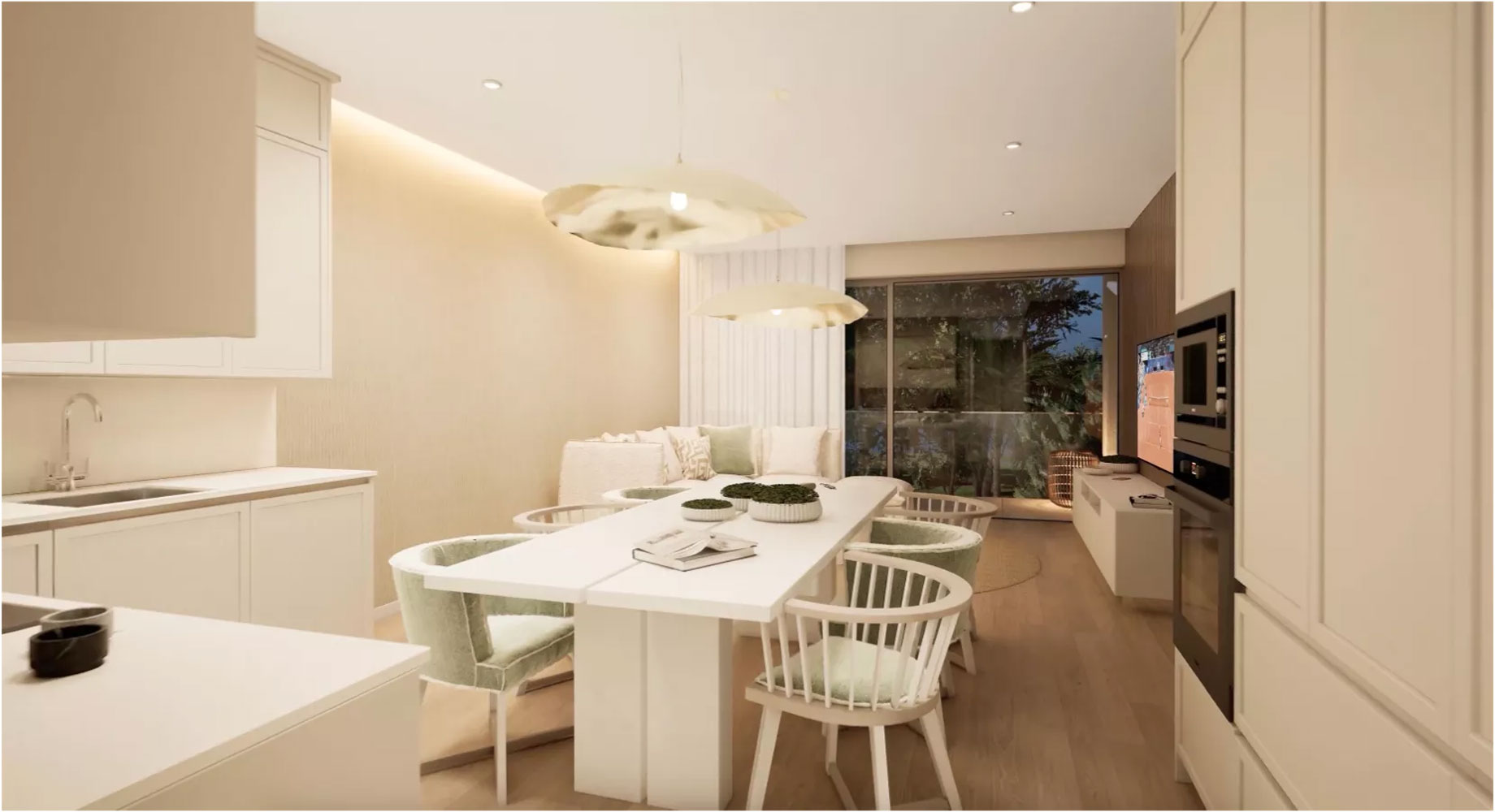 Condomínio com 21 apartamentos, estacionamento em cave, jardim e piscinas.