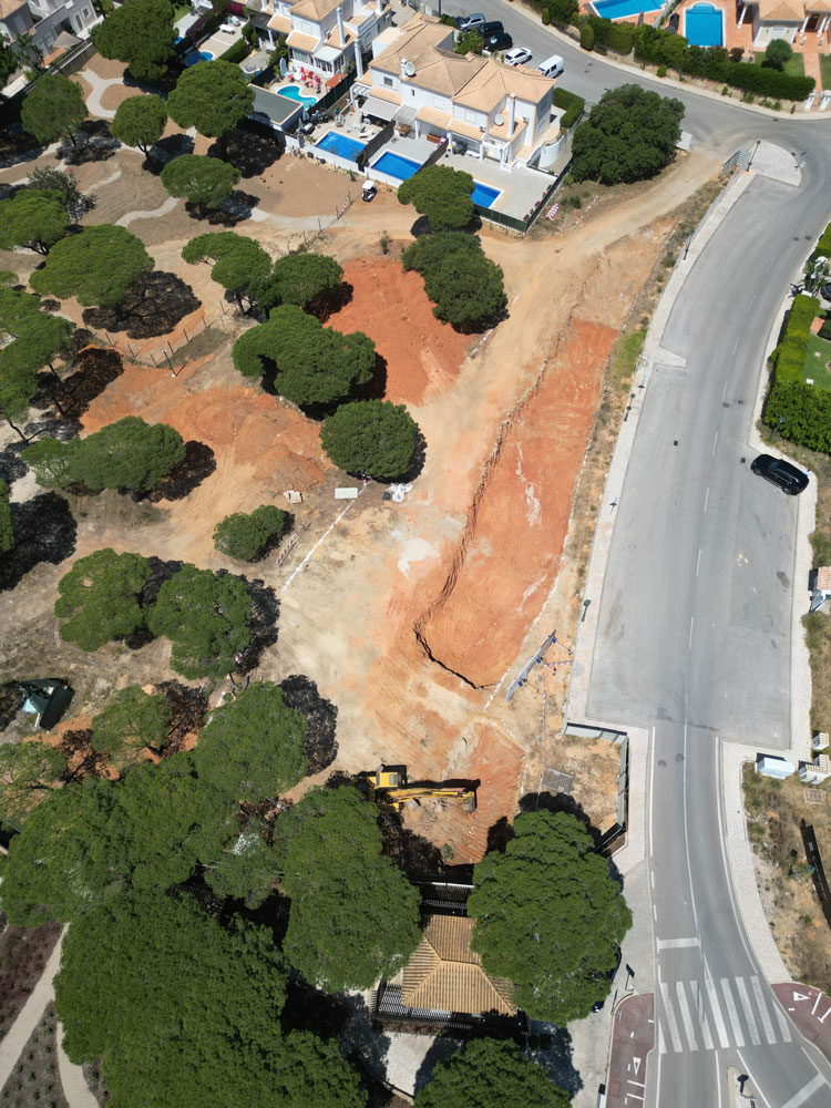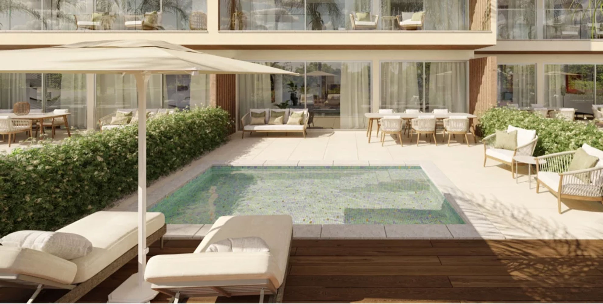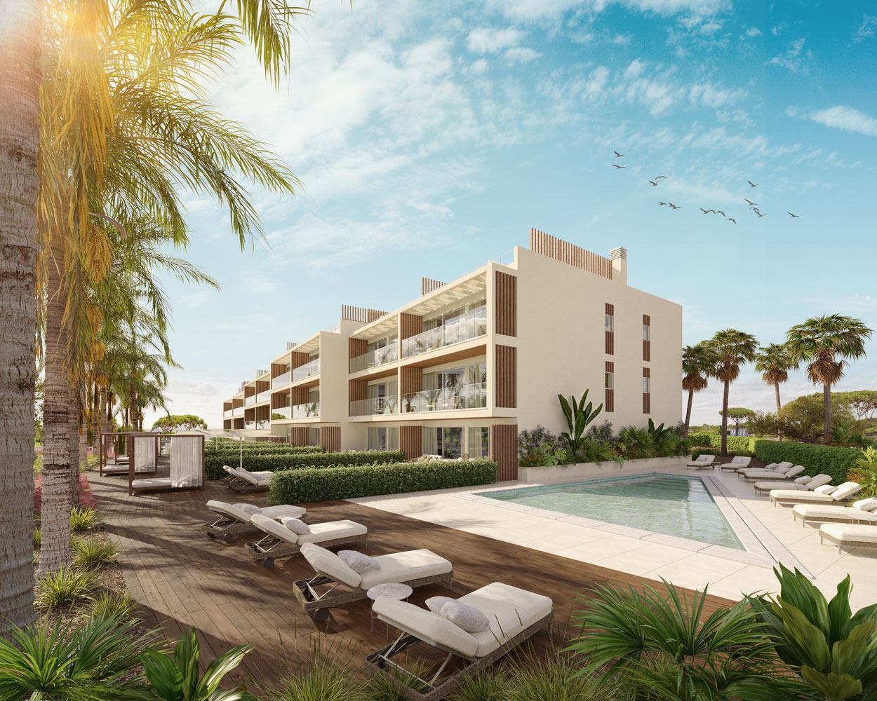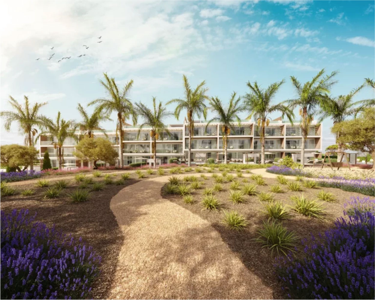 Condomínio com 21 apartamentos, estacionamento em cave, jardim e piscinas.