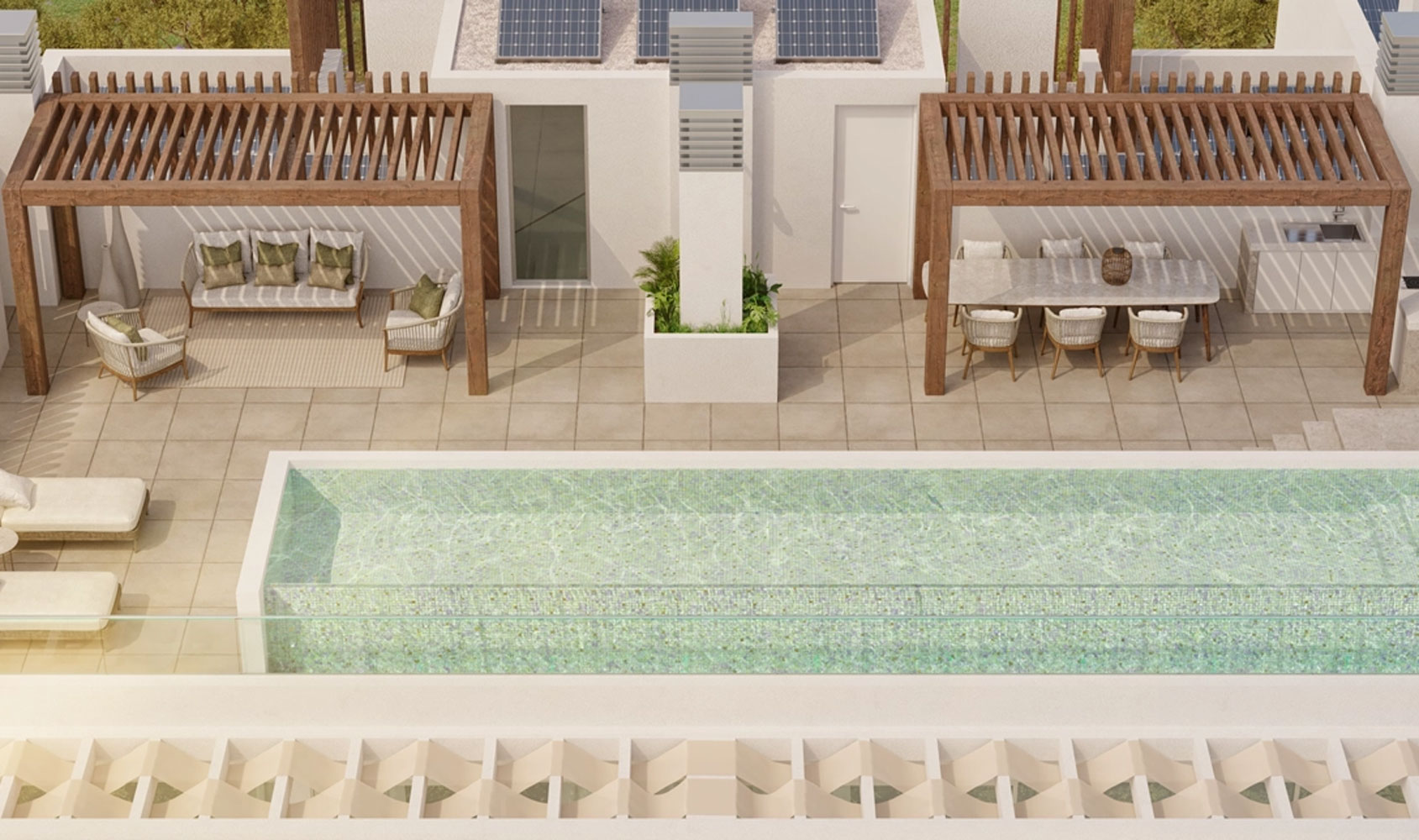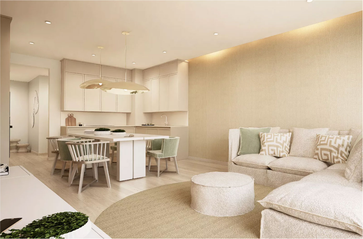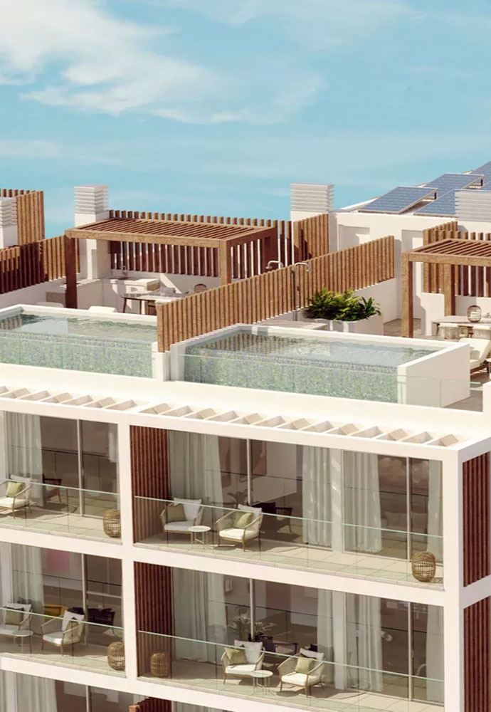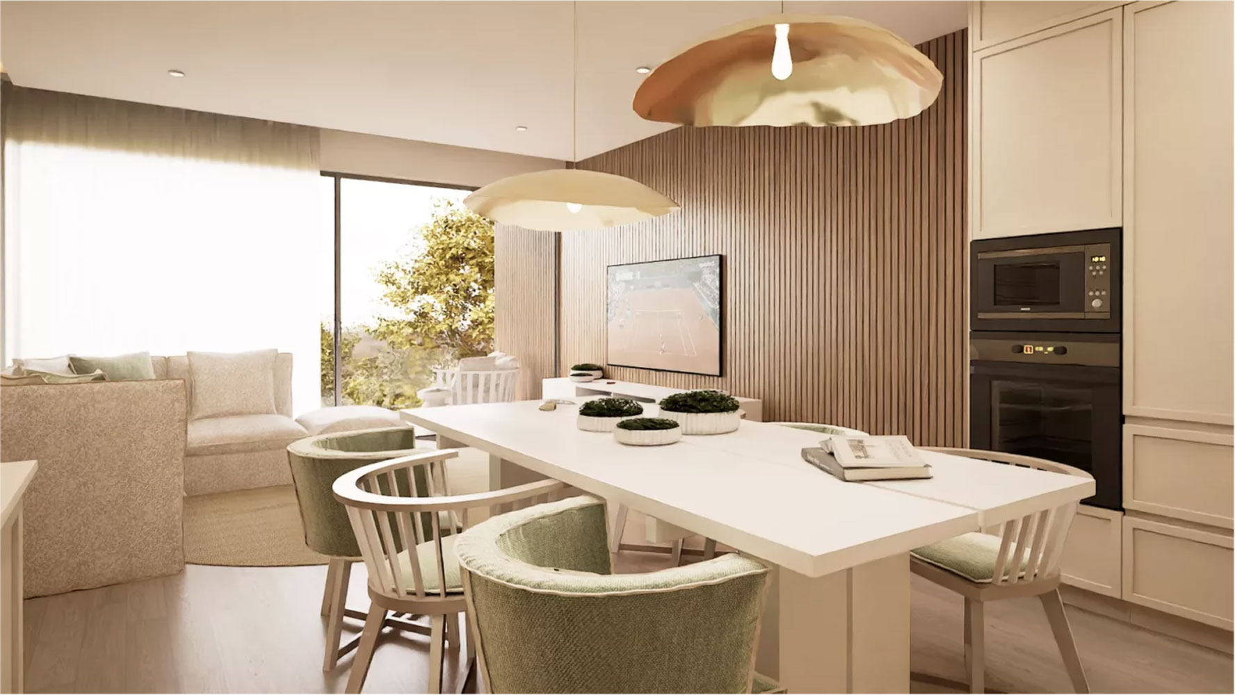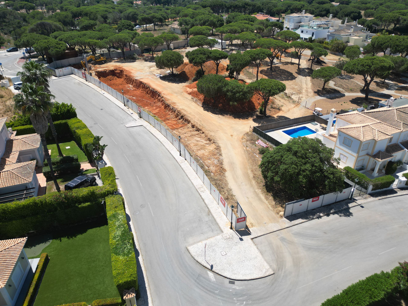 Condomínio com 21 apartamentos, estacionamento em cave, jardim e piscinas.