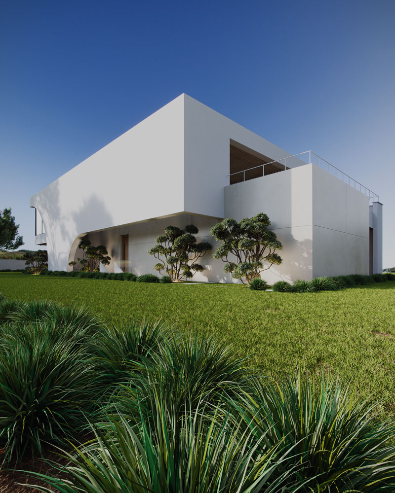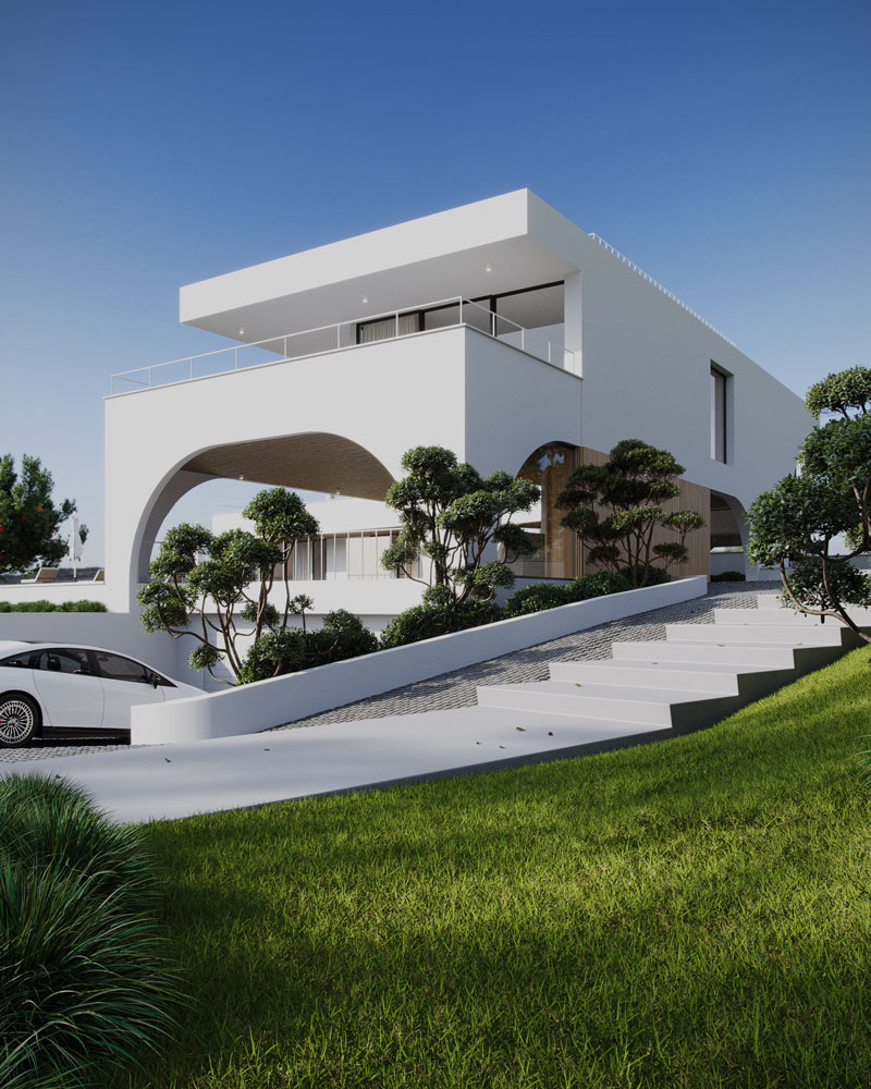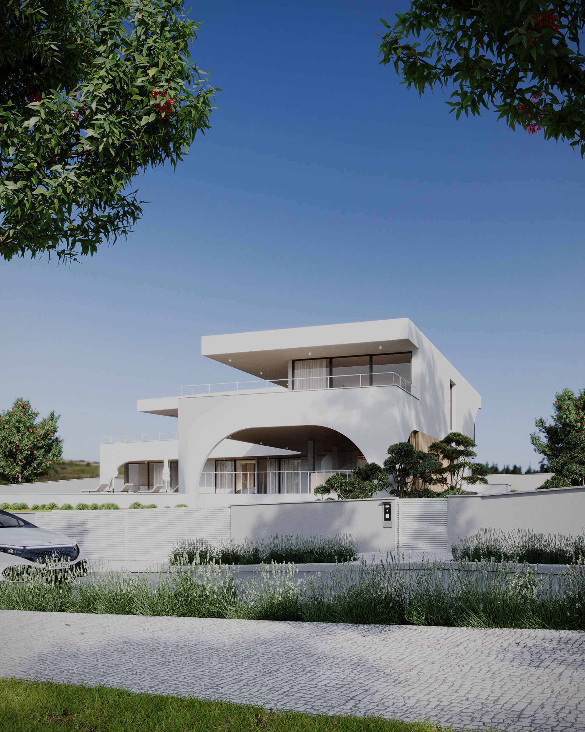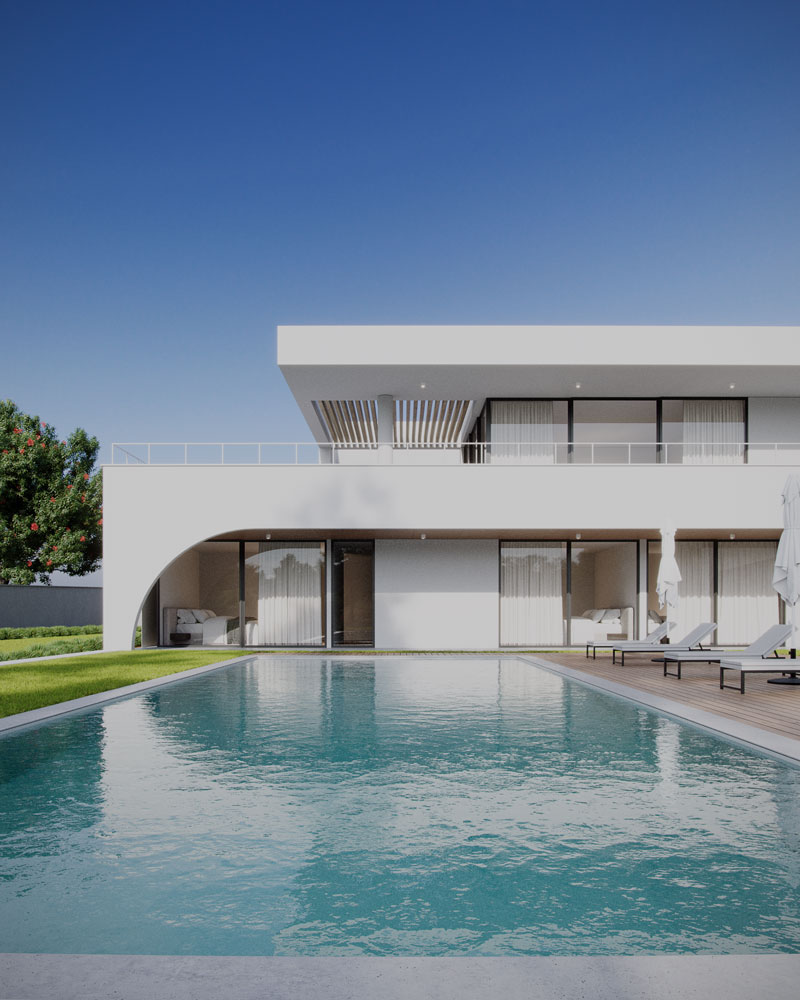 Construção de moradia unifamiliar com jardim e piscina, em loteamento urbano.